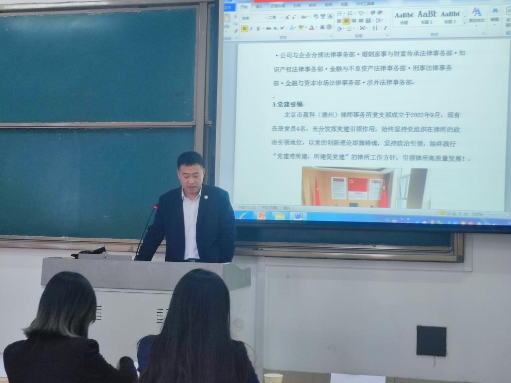 交流会上,盈科律师事务所执行副主任李方超介绍了盈科律师事务所的现状,包括在全球的分布情况和合伙人、律师等资源情况,并播放了盈科律所的宣传片;之后党支部书记付辉向员工们详细的介绍律师这一职业;最后盈科律师事务所一行人对同学们所提出的问题进行解答。通过盈科律所一行人的介绍和回答,同学们对法学这一专业有更全面的了解,对律师这一行业也有了更加深刻的认识。