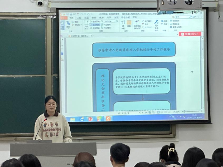 本次培训会议由院员工会分管主席公瑶主持,她从申请入团、入团积极分子的确定、入团积极分子的教育、培养和考察、发展对象的确定、新团员的接受六个部分具体阐述了发展团员工作流程,并结合365英国上市实际,为同学们介绍了《共青团推优入党工作实施方案》,具体介绍了推优入党的范围、条件和比例等。她鼓励学员们作为新时代青年,要努力奋斗,勇于担当时代使命,传承红色精神。