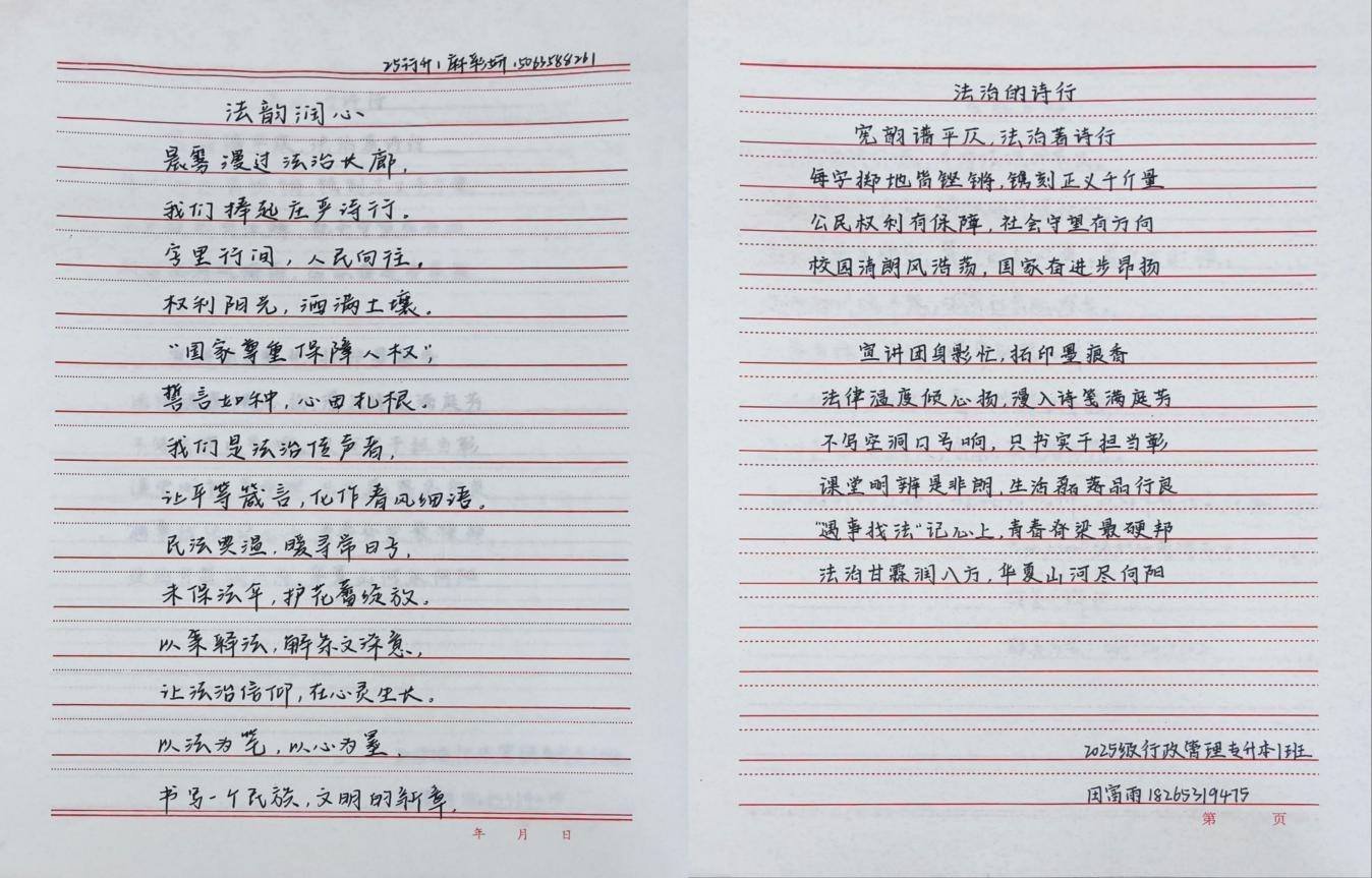 活动期间,同学们踊跃参与,围绕“宪法精神”“法律常识”“法治实践”等方向,提交了60余份诗歌作品。这些作品以现代诗、格律诗、散文诗等多种形式,从不同视角诠释宪法内涵,将专业法律知识与艺术表达深度融合,用凝练的语言、生动的意象展现对宪法精神的深刻理解与真挚情感。经过评审,最终评选出一、二、三等奖共30份。这些充满法治温度与文学美感的作品,是同学们法治素养与创作才能的集中体现。