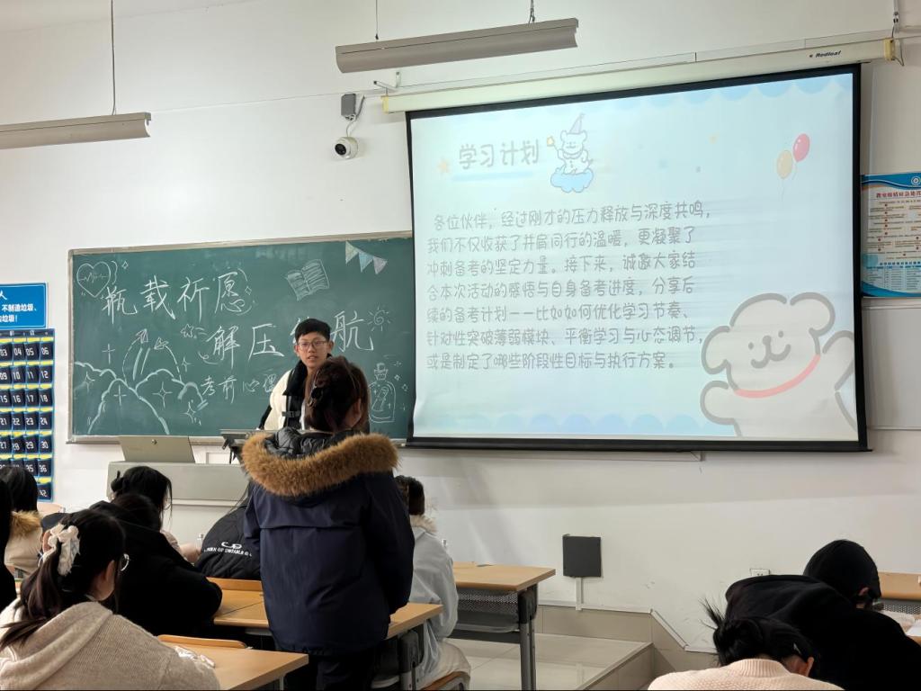 活动伊始,主讲人通过趣味问答和生动漫画,讲解了焦虑的常见表现,并针对四六级考试的核心焦虑特征进行了深入解析,引导同学们科学认识自身的考前心理状态。随后,同学们在卡片正面写下备考过程中的焦虑与烦恼,反面则书写心愿或鼓励的话语,折好后放入心愿瓶并加以装饰。大家在动手过程中有效释放了心理压力,感受到了情绪疏解的轻松。在“互助赋能”环节,同学们分享了备考中的“崩溃瞬间”,通过其他同学的幽默接梗与暖心鼓励,焦虑情绪在轻松的氛围中逐渐化解。最后,大家结合自身感悟与备考进度,交流复习规划,凝聚起共同冲刺的力量。