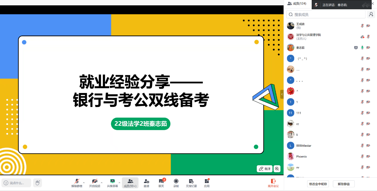 西部计划分享环节,法学专业优秀毕业生董妍详细分享了基层服务日常与个人成长收获,鼓励同学们投身基层、践行青春担当;同为西部计划志愿者的赵生缘,结合自身服务经历,讲解基层岗位实践价值,为有意向参与西部计划的同学提供翔实参考。