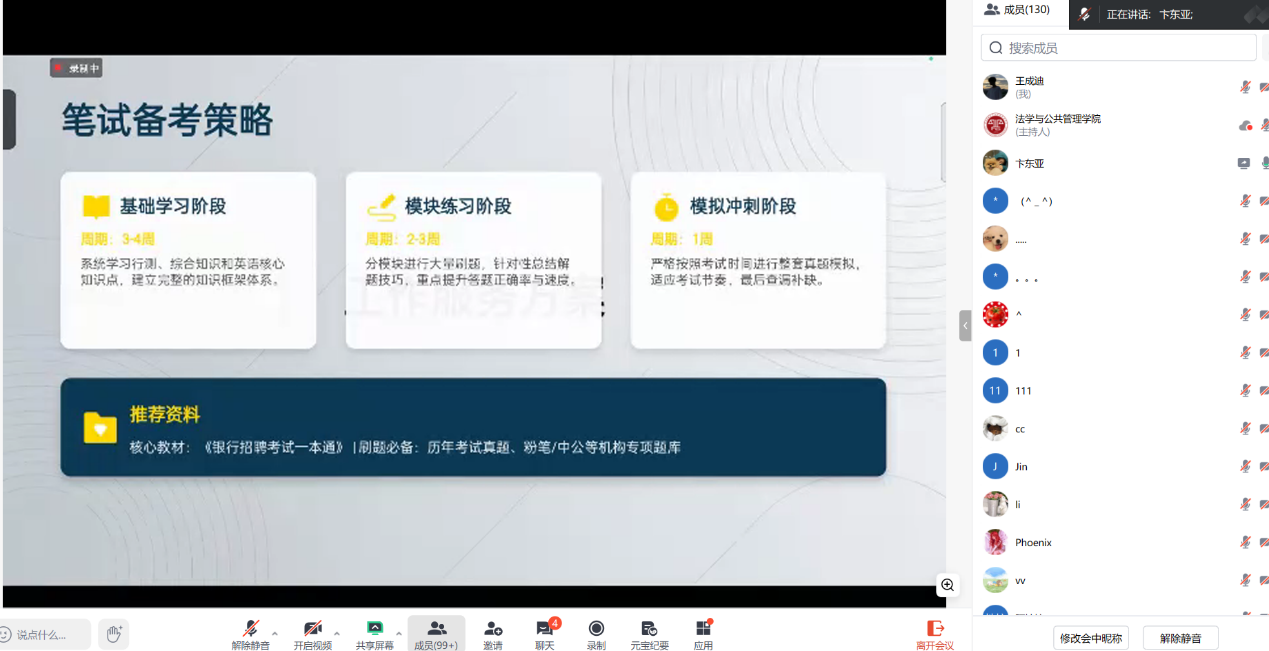 银行就业板块,卞东亚结合自身成功签约银行的经历,重点分享银行校招备考策略、半结构化与无领导小组面试技巧,强调专业与岗位适配性的核心要点;秦志茹结合自身银行与国家公务员双线备考的经历,分享了兼顾两类备考的时间规划、复习重点与高效方法,传授实用备考与面试经验。